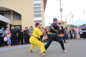 Prosesi palang pintu yang menyambut kedatangan rombongan pengantin pria dalam acara Tangerang Ngebesan di depan Gedung Pusat Pemerintahan Kota Tangerang.